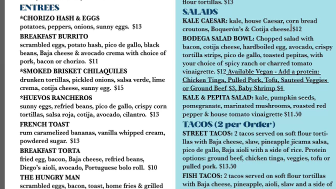 Flour tortillas, pan seared cod, Baja cheese, pineapple salsa, Diego's aioli & slaw